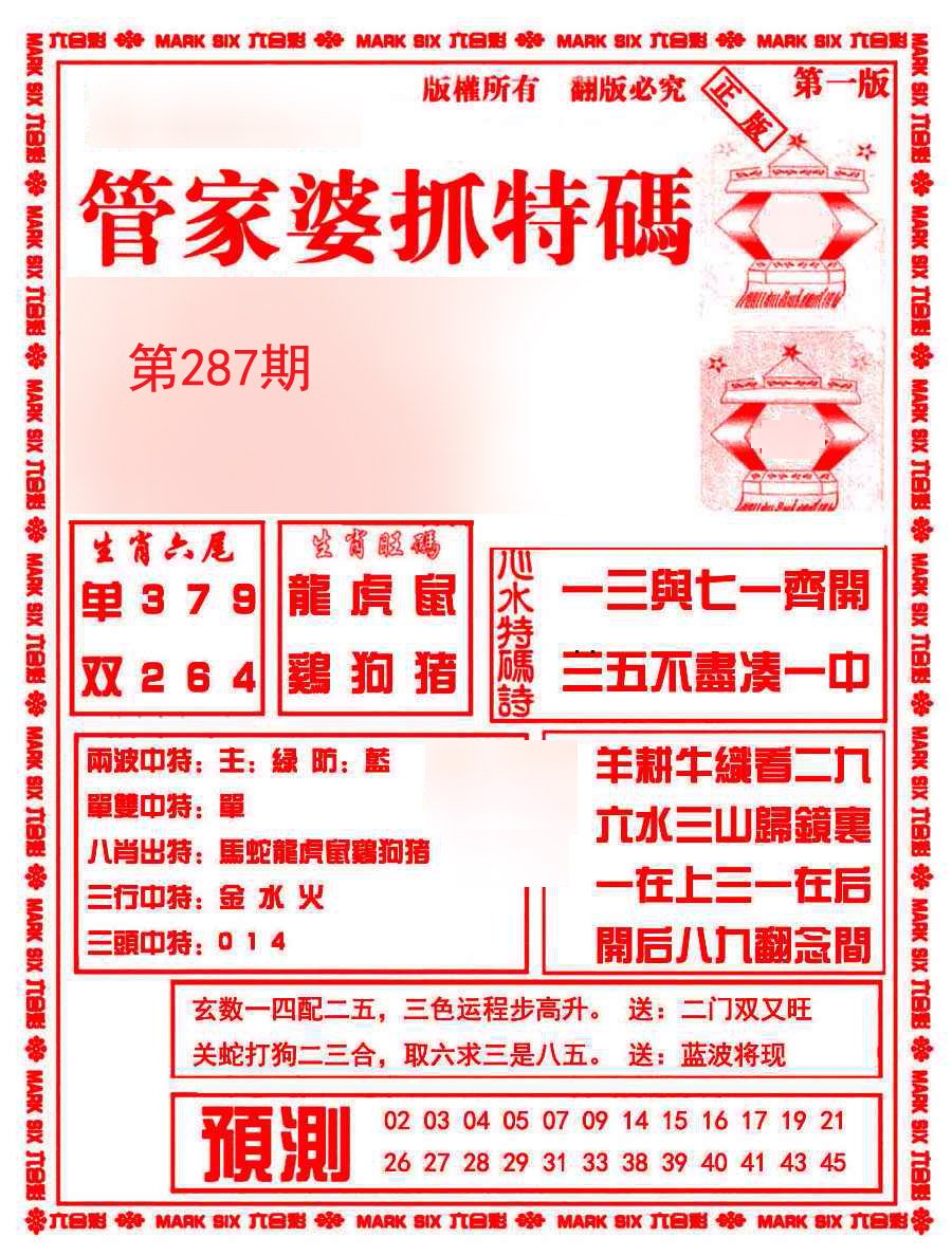 287期:公式一肖 | 287期:公式一波 | 287期:公式单双 |